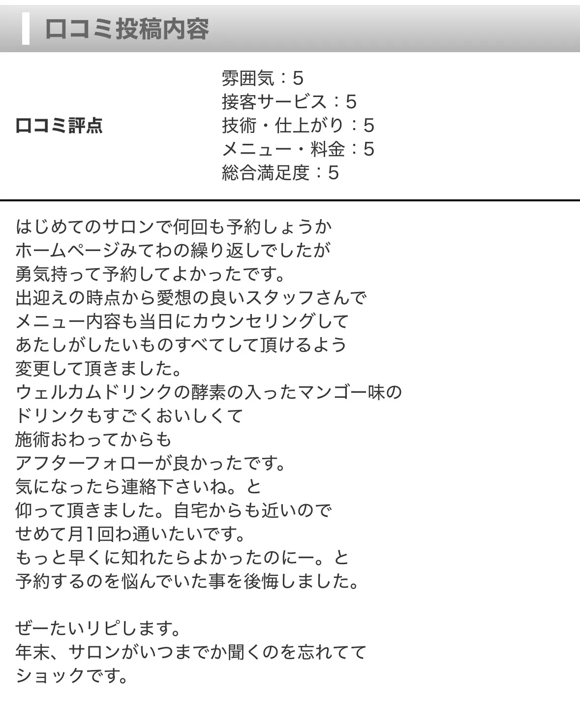 施術後は自宅でのケア方法もアドバイスしており、良い状態を長く保つサポートも充実しています。初めてエステを利用される方や、これまでのケアで満足できなかった方にも安心しておすすめできる内容です。